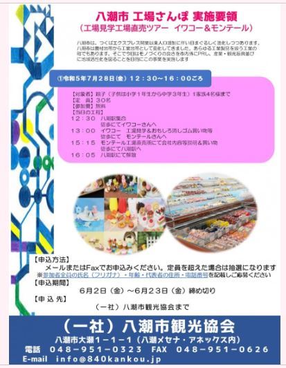 5月19日(金曜日)までに、(一社)八潮市観光協会あてメールまたはFAXにて参加者全員の氏名(フリガナ)・住所・年齢・代表者電話番号を記載しご応募ください。