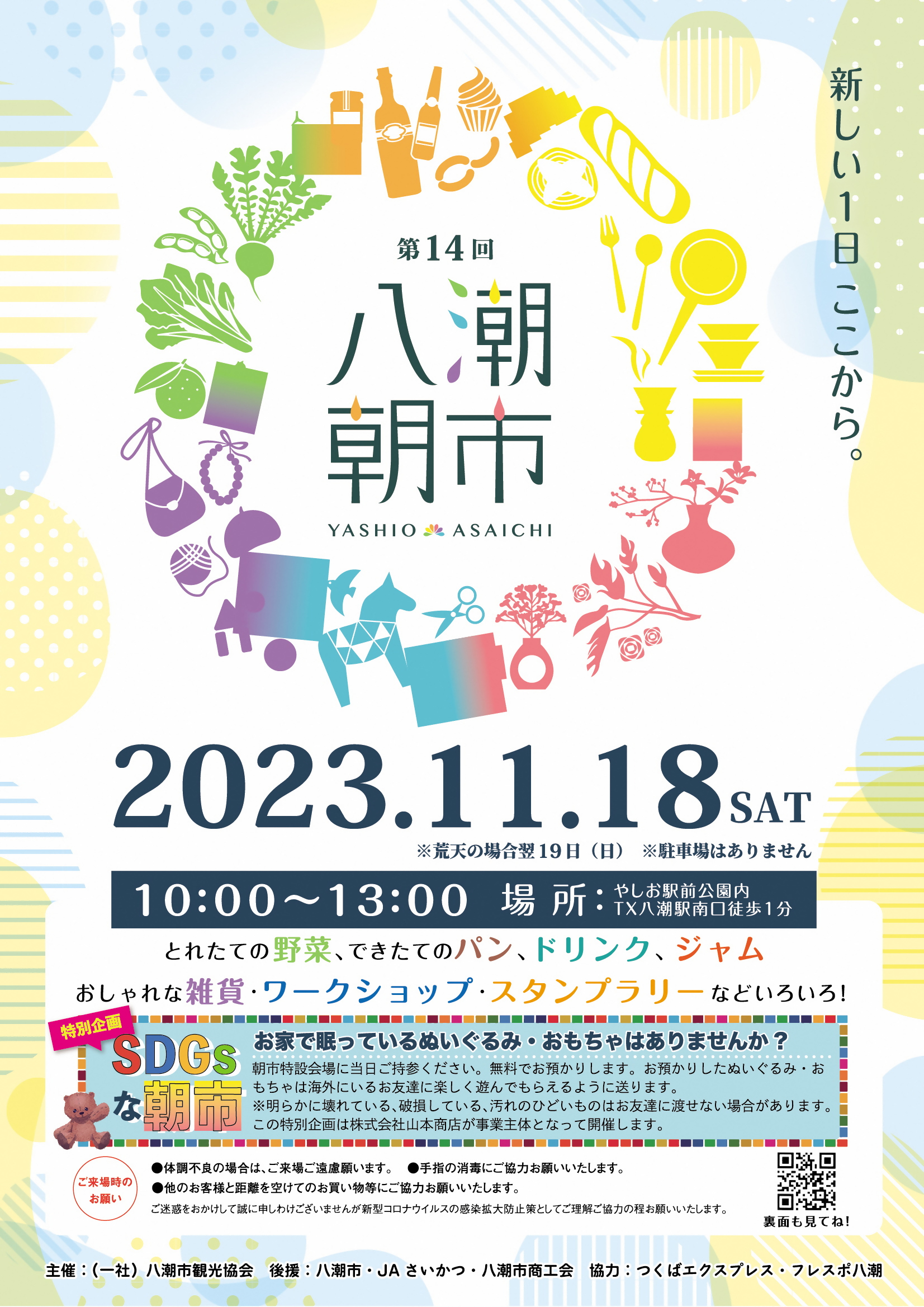 (一社)八潮市観光協会主催による「八潮朝市」がやしお駅前公園で開催されます。