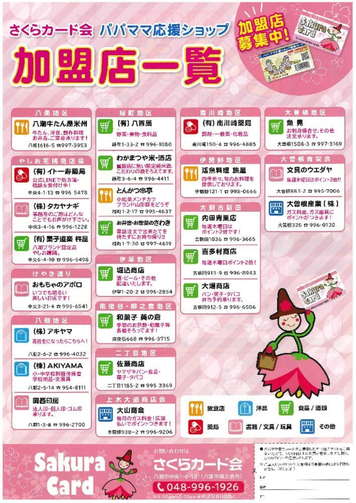 「さくらカード会」では、市内24店舗の加盟店で買い物をすると、税抜き100円で1ポイントが進呈され、進呈されたポイントは1ポイント=1円で、各加盟店でのお買い物やサービスに利用できるポイントカードを発行しています。