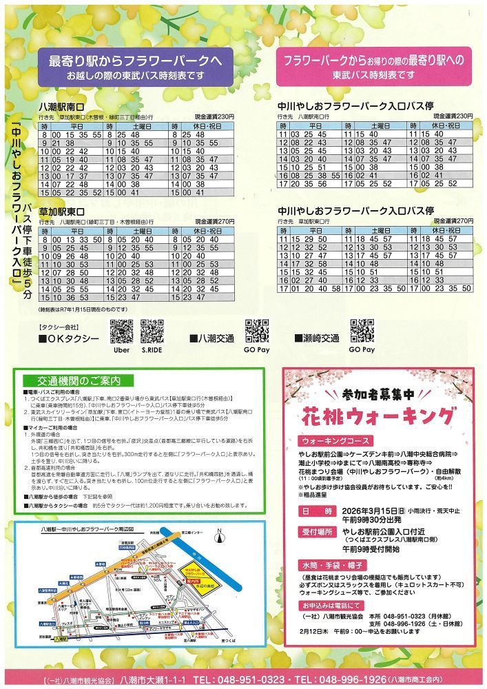 内 容:約4kmのウォーキング「やしお駅前公園→ケーズデンキ前→八潮中央総合病院→潮止小学校→ゆまにて→八潮南高校→専稱寺→花桃まつり会場(中川やしおフラワーパーク)・自由解散」(午前11時ごろ到着予定)