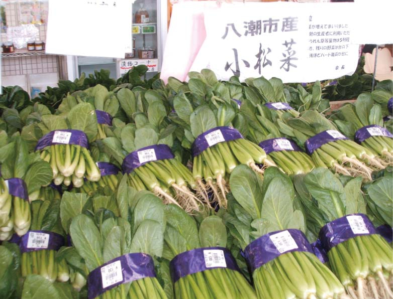 季節の朝取り野菜がズラリと並ぶ農産物直売所。八潮といえば小松菜。味噌汁、おひたし以外にもお新香やゴマあえなどもおすすめ。パンに入れてもOK!カルシウムはほうれん草の3倍といわれ、伸び盛りの子供達にも栄養満点な万能野菜だ。季節を問わず一年中食べられ、どんな野菜にも使いやすいから食卓の常備菜としてぜひ冷蔵庫に常備したい。