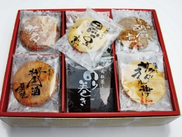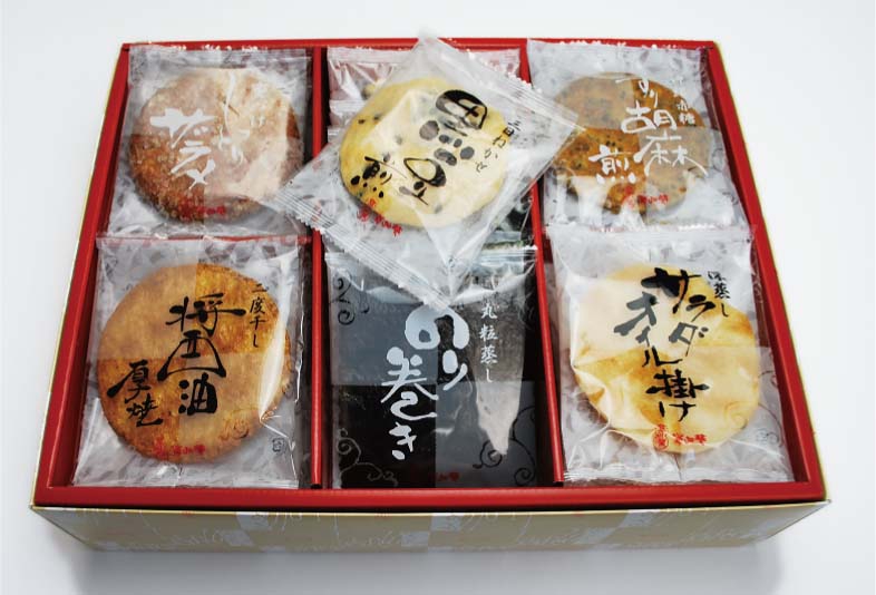 関東で煎餅といえば「草加煎餅」と知られております。草加本焼は国産米のみを使用し、草加煎餅伝統の技で、焼き上げた逸品です。こだわりぬいて造った6種類(醤油、ざらめ、すり胡麻、黒豆、海苔巻、サラダ)の煎餅が入っております。