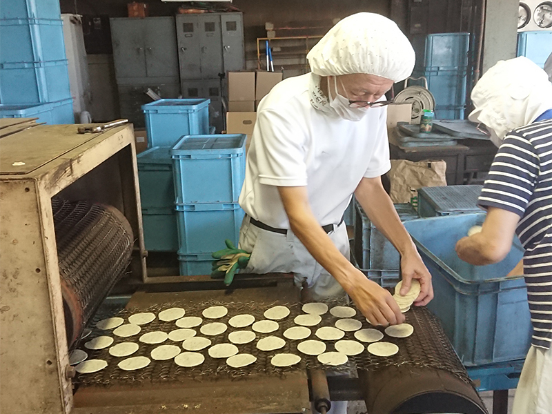 本間さんは、創業100年を超える老舗を営む米菓製造の技術者です。国産原料にこだわり、製品に適した生地の水分量、焼き加減などを見極め、草加せんべいをソフトに焼き上げています。