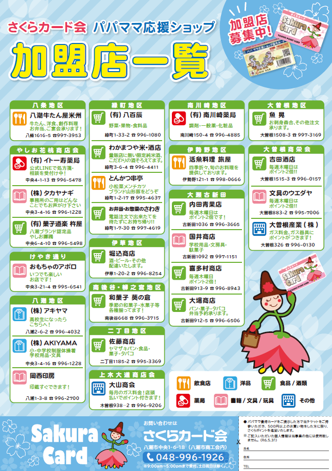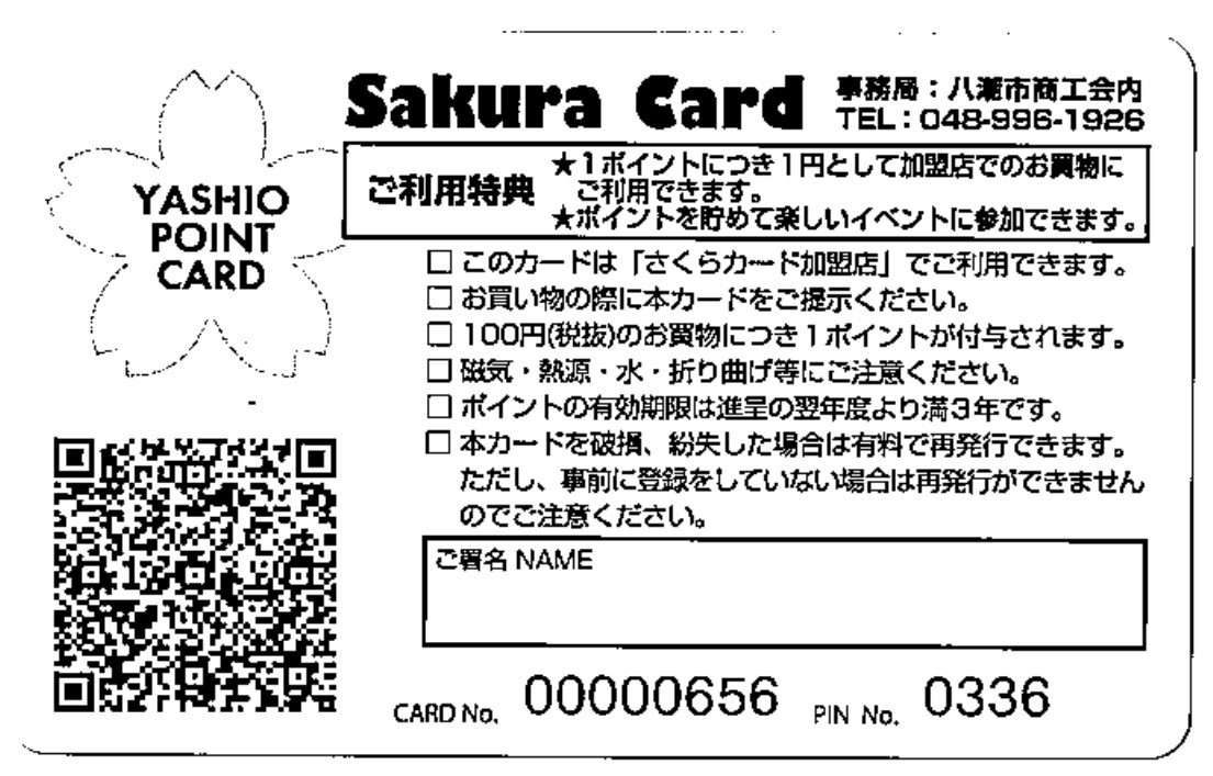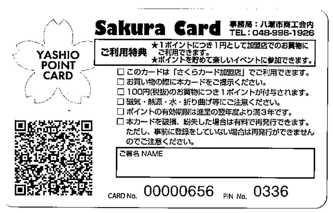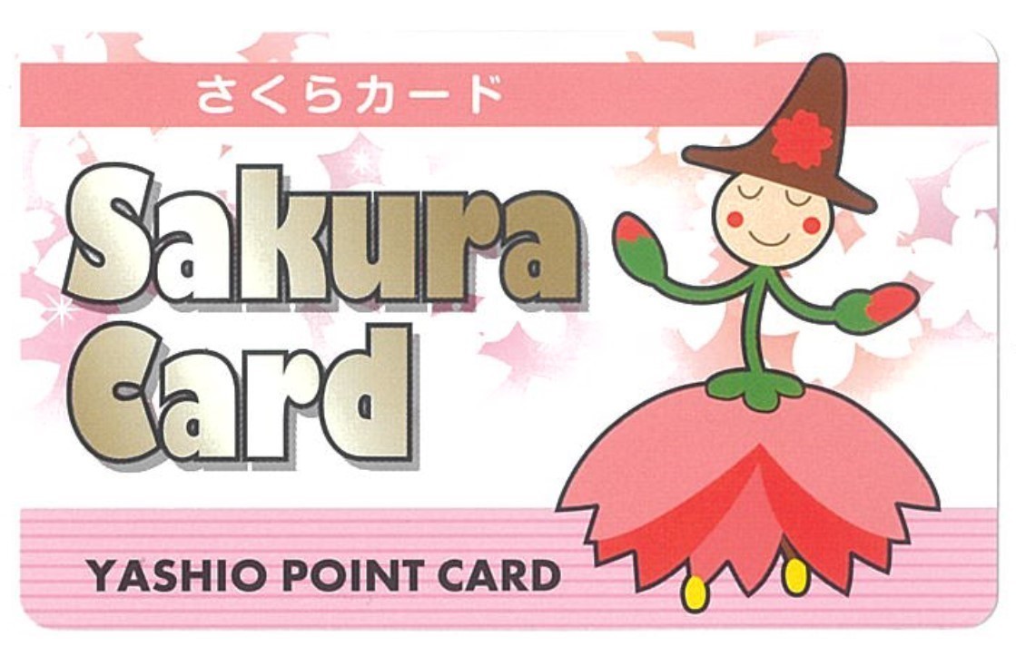 「さくらカード会」では、市内24店舗の加盟店で買い物をすると、税抜き100円で1ポイントが進呈され、進呈されたポイントは1ポイント=1円で、各加盟店でのお買い物やサービスに利用できるポイントカードを発行しています。