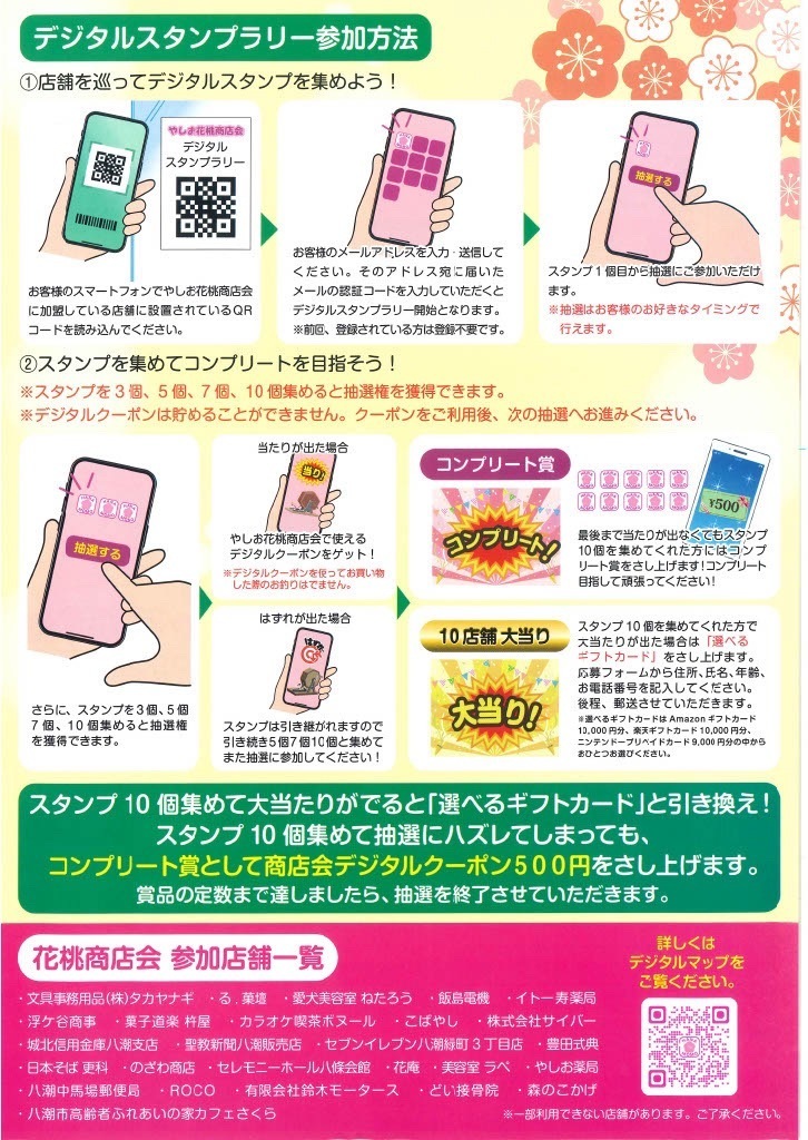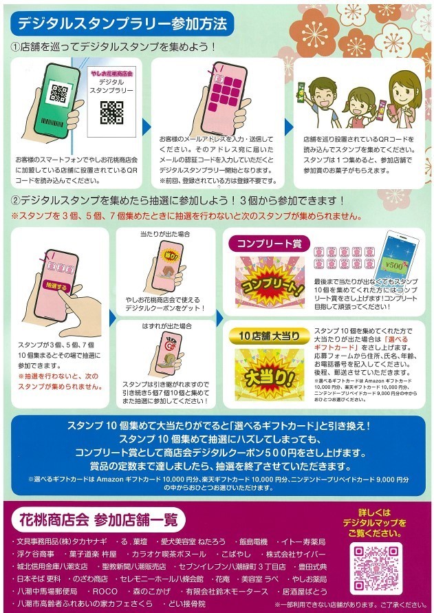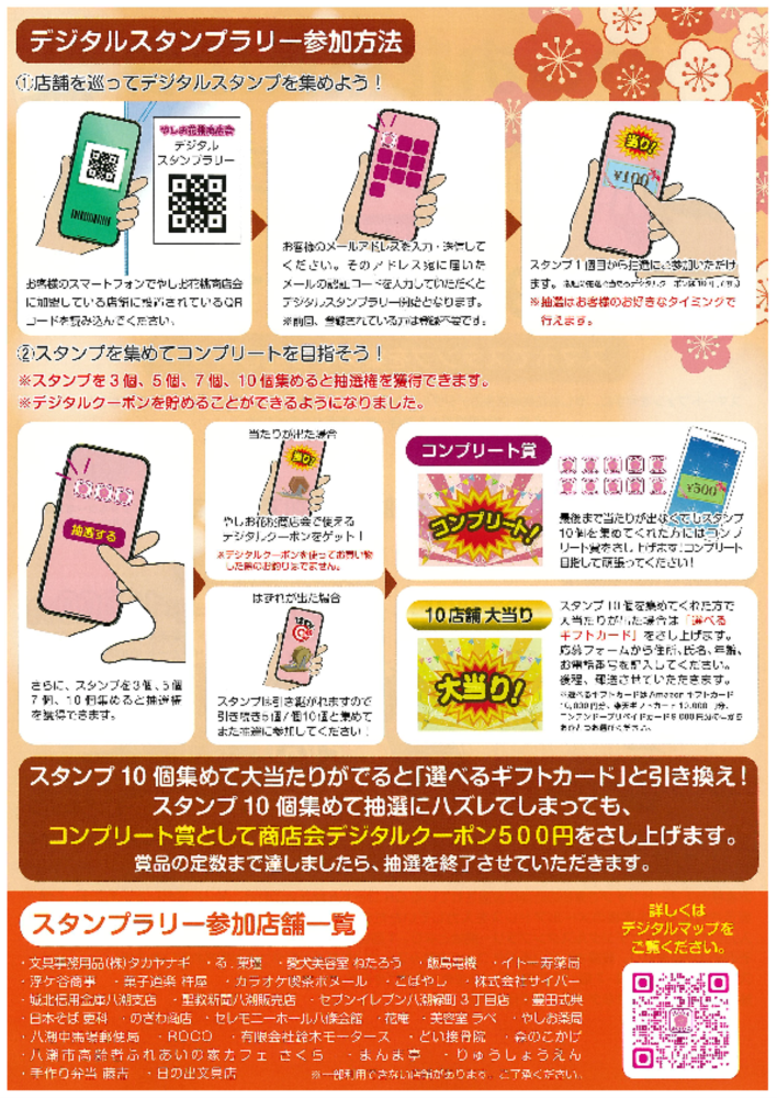 やしお花桃商店会では、デジタルマップを活用し、夏のスタンプラリーを開催します。